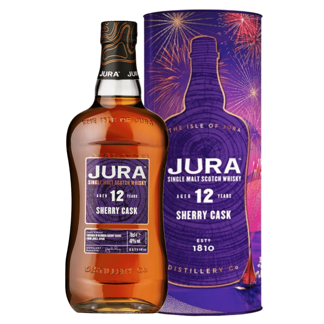 Jura 12 Year Old Sherry Cask is a classic, unpeated Jura, matured in American white oak ex bourbon barrels then finished in aged, hand-selected Oloroso sherry casks from Jerez, Spain, adding a distinctive flair to this lively single malt.