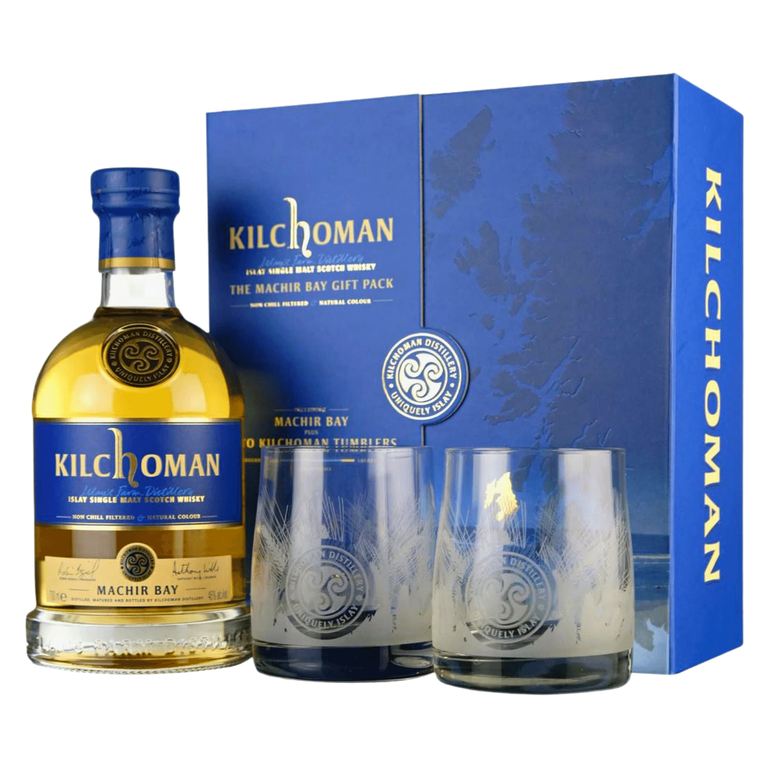 Giftpack comes with one bottle of Kilchoman Machir Bay 70cl and 2 Whisky Tumblers.