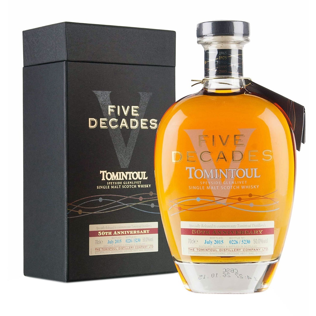 Tomintoul have marked the 50th anniversary of spirit flowing from its stills with this stunning release composed of whiskies from each decade. Casks were chosen from 1965, 1975, 1985, 1995 and 2005 by Master Distiller, Robert Fleming, producing 5,230 individually numbered bottles. This Limited Edition bottling of Tomintoul Five Decades is bottled at 50%.